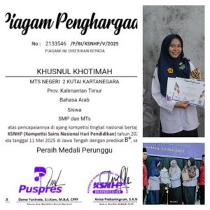 Kukar (Madrasah) – Selasa (27/5), Kukar (MTsN 2 Kukar) – Prestasi membanggakan kembali ditorehkan oleh siswa MTsN 2 Kutai Kartanegara. Khusnul Khotimah, siswi kelas 8D, berhasil meraih penghargaan dalam ajang Kompetisi Sains Nasional (KSN) Hari Pendidikan Nasional 2025 bidang Bahasa Arab jenjang SMP/MTs. Kegiatan bergengsi ini diselenggarakan oleh Braindicator Indonesia Pusat Prestasi secara online pada 11 Mei 2025 yang lalu dan dipusatkan dari Jawa Tengah.